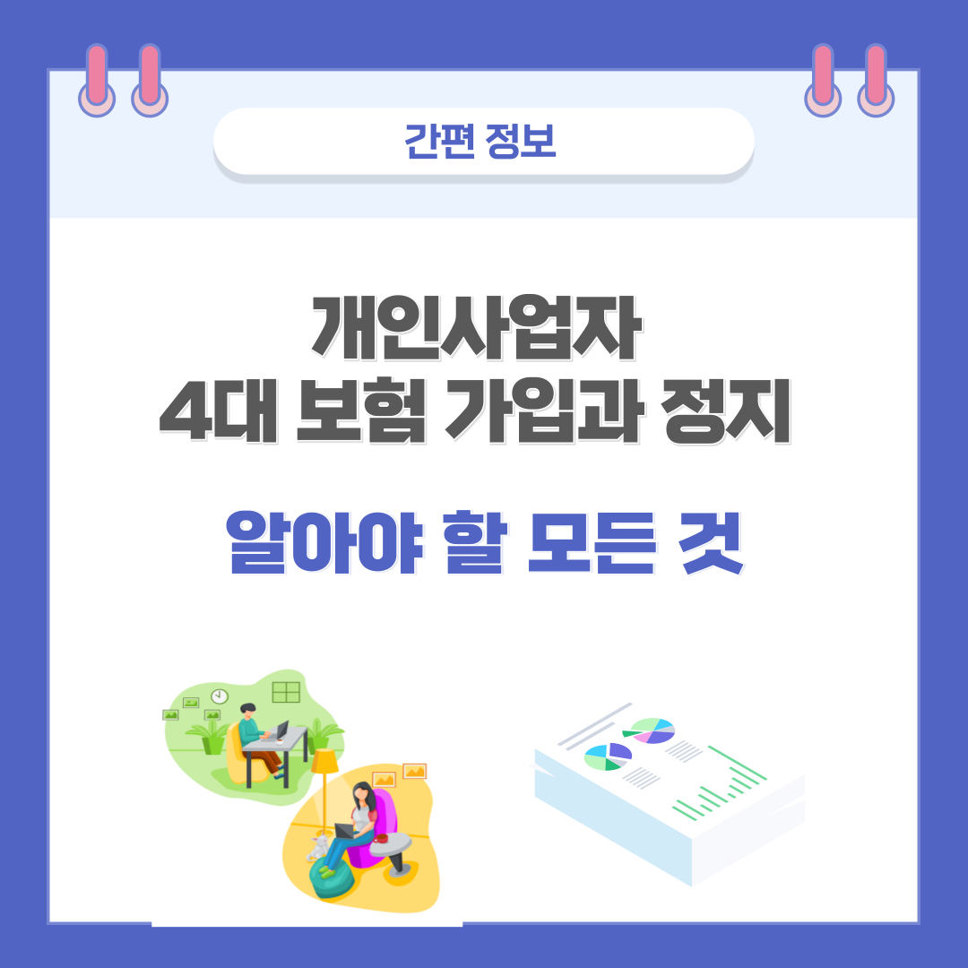 혼자서 사업을 시작하신 개인사업자 중에는 4대 보험 가입에 대해 복잡하고 어렵게 느껴지는 분들이 많을 것입니다. 이 글을 통해서 개인사업자가 꼭 알아야 할 4대 보험 가입과 정지에 대해서 알고 쉽게 설명해드리겠습니다.