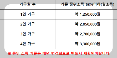 - 소득 기준은 주민센터, 온라인 확인, 콜센터 문의(보건복지콜센터 129)를 통해서 확인할 수 있습니다.